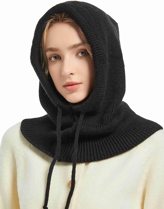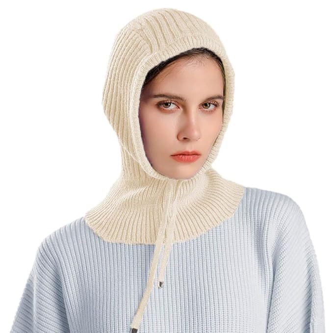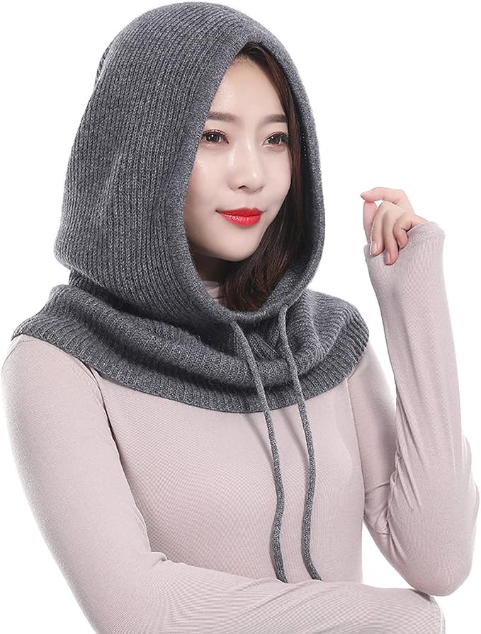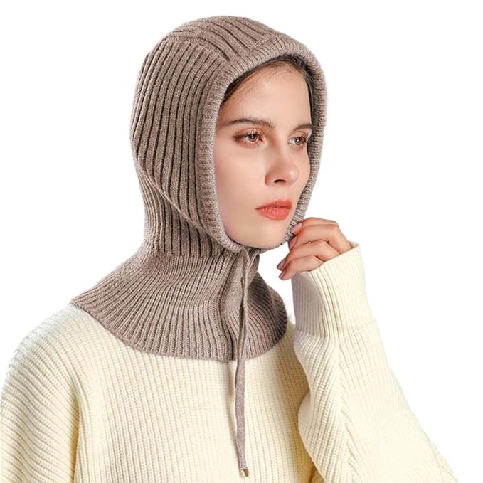 Hooded Scarf Hat for Women Warm Unisex Balaclava Pullover Knitted Beanie with Drawstring Outdoor Sports Mask