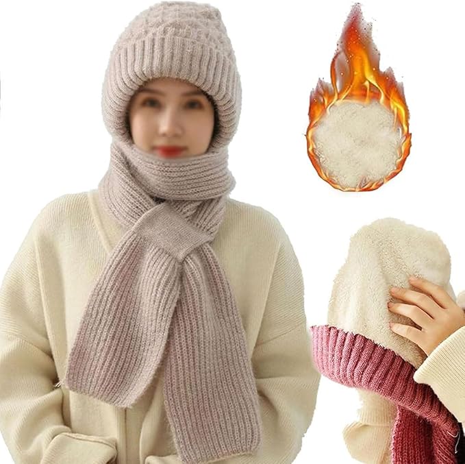 Women Balaclava Hood Scarf Hat Knitted Fleece Elastic Winter Integrated Ear Protection Windproof Cap Beanie Hat