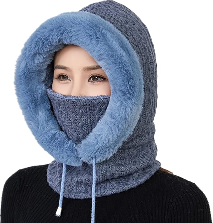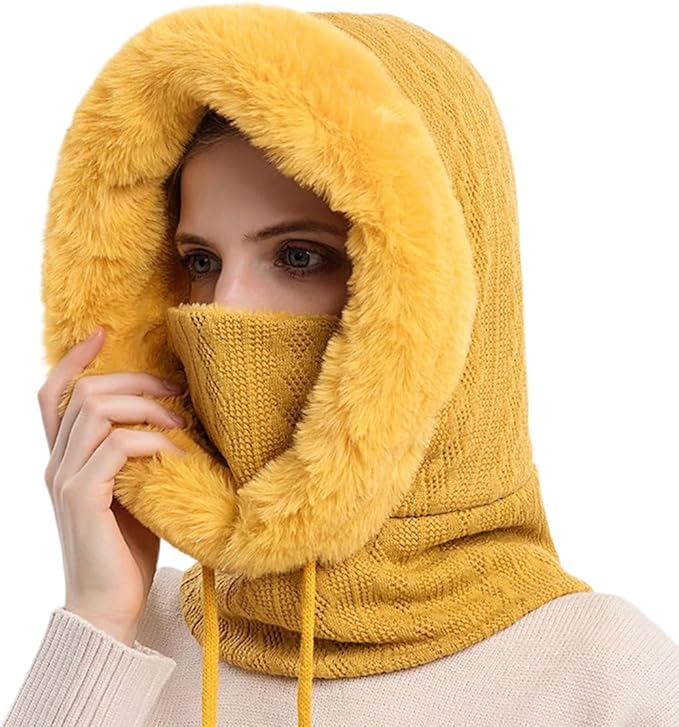 Winter Hats for Women Balaclava Knit Beanie with Adjustable Drawstring Warm Hooded Scarf Skull Cap