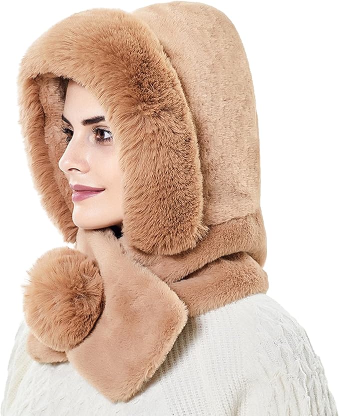 Women Winter Warm Hooded Scarf Hat Knit Ski Mask Balaclava Neck Warmer Faux Fur Knit Beanie Hood Scarf Unisex