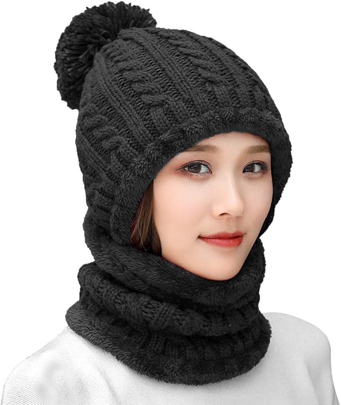 Women Winter Beanie Hats One Piece Fleece Lined Knit Balaclavas Mask Set Skull Neck Circle Scarf Ski Snow Hat Pompom